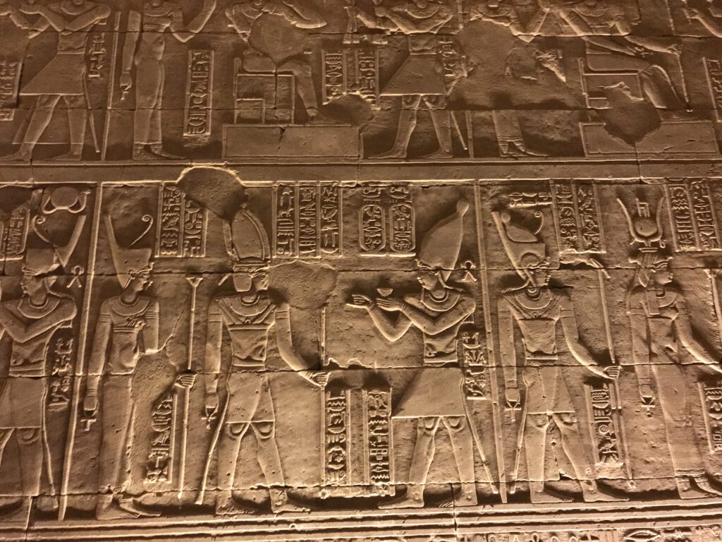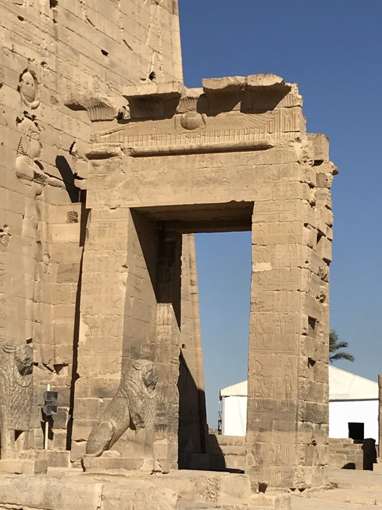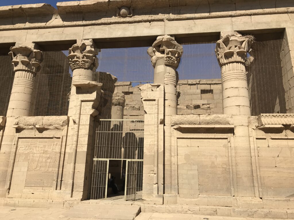 This morning, we are in the heart of ancient Nubia, Egypt’s gateway to Africa. We began with a tour of New Kalabasha, site of the Kalabasha Temple, the largest freestanding Nubian temple. This sandstone temple dedicated to Mandulis, the Nubian god of religion, preserves Egyptian and Greek history, both languages are carved into the temple walls. It is the “Temple of Unification between the Nubians and the Egyptians”—the God Horus and the God Mandulis and is about 2,000 years old. It was originally located at Bab al-Kalabsha (Gate of Kalabsha), approximately 50 km south of Aswan and built around 30 BC. It has an eight column hall with inscriptions and motifs indicating the life of kings and their encounters with the gods. From Kalabsha’s sanctuary chambers, a staircase leads up to the roof of the temple where one can see a splendid view of the temple itself and the sacred lake. Several historical records were inscribed on the temple walls. When Christianity came to Egypt the temple was used as a church. The temple was moved to a site just south of the Aswan High Dam when the area was flooded. The pictures below are a sampling of he many I took of this temple.