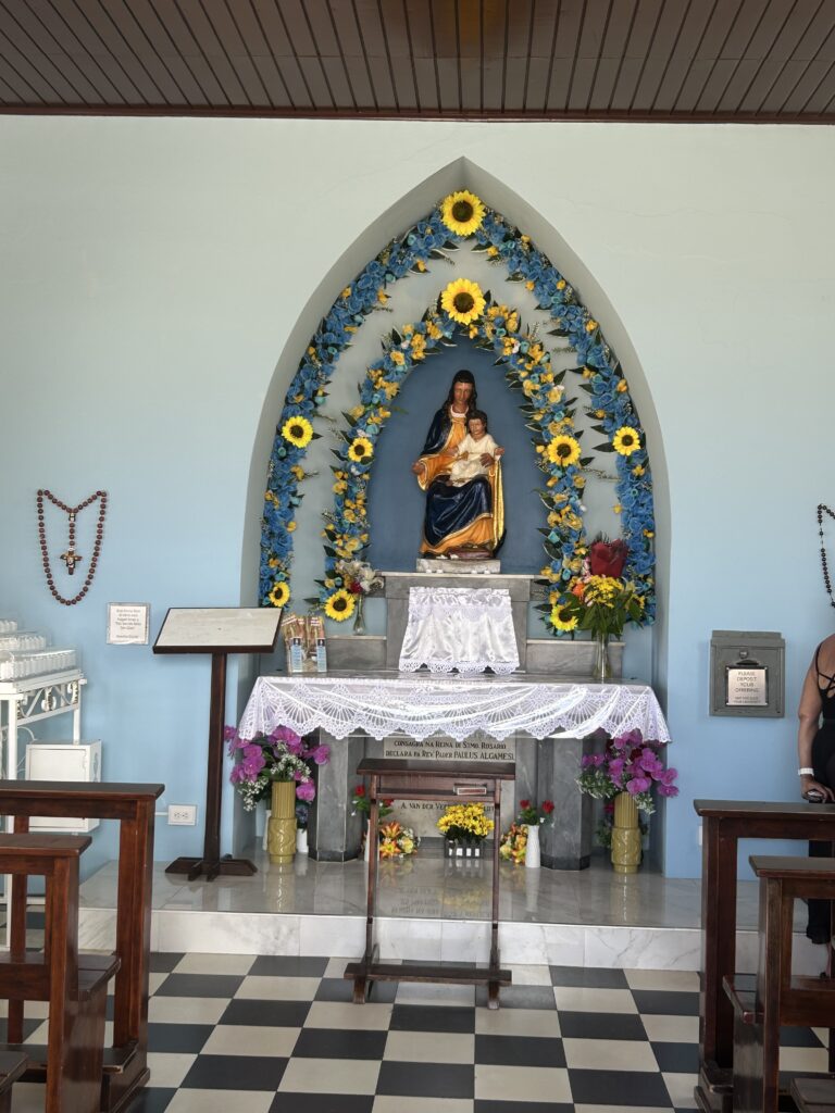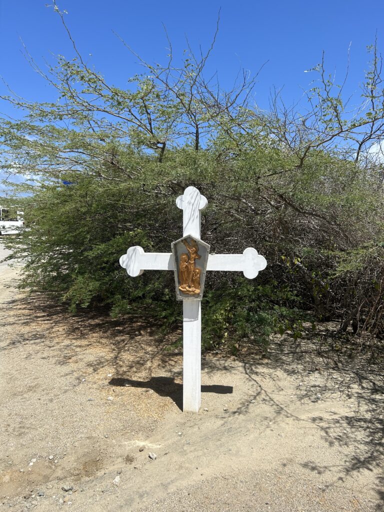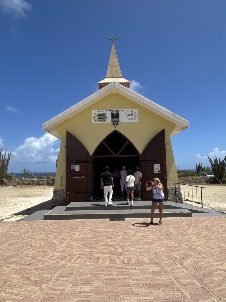 The next stop was the Alta Vista Chapel. This is a small Roman Catholic chapel on the hills above the north shore of the island. The road up to the chapel is lined with stations of the cross. The original chapel was built by Caquetio Indians and Spanish and was the result of the work of Domingo Antionio Silvestre, a Venezuelan missionary. It had stone walls and a straw roof and was dedicated to Mother Mary. It is the first church in Aruba.