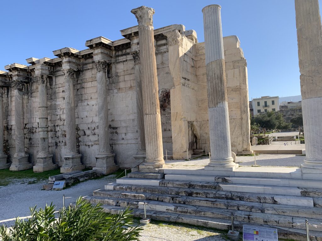 Today we set out for Ancient Agora and Temple of Hephaestus. There was a strike today, so our taxi driver tried to take a back way to the Ancient Agora. He got stuck in some road work and had to back up a long way in rush hour traffic. It was some trip. He let us off close and told us how to find it. We took a long detour through the old part of Athens but eventually got there. On the way we saw the remains of the Library of Hadrian. Hadrian’s Library was built in 132 C.E. as part of the Roman Emperor’s plans to make Athens a major cultural center. Its 100 columns and high walls were designed to make a big impression
