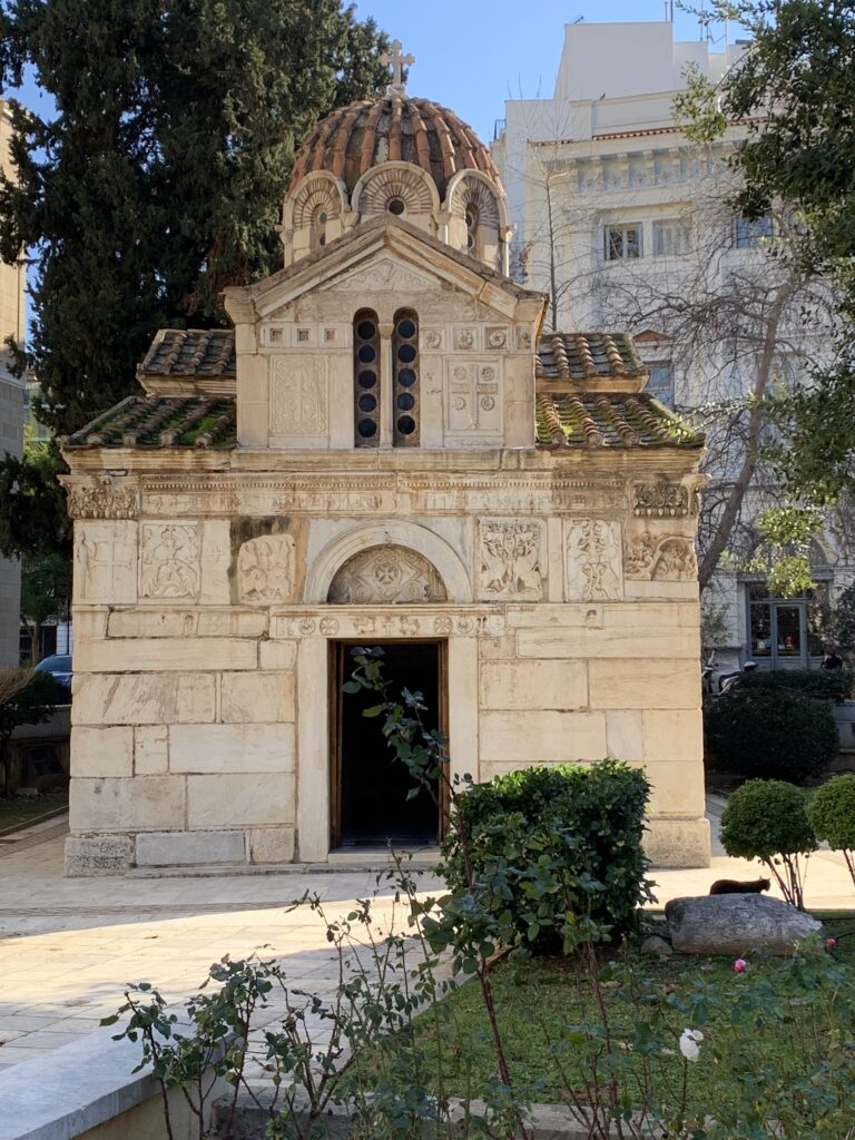 Then we took a wrong turn and walked to a small Greek Orthodox church, Church of Virgin Mary Gorgoepekoos and Saint Eleutherius. This is a 12th century church built on the ruins of an ancient temple dedicated to Eileithyia. Its well-preserved dome is considered the best example of Athenian dome structure.