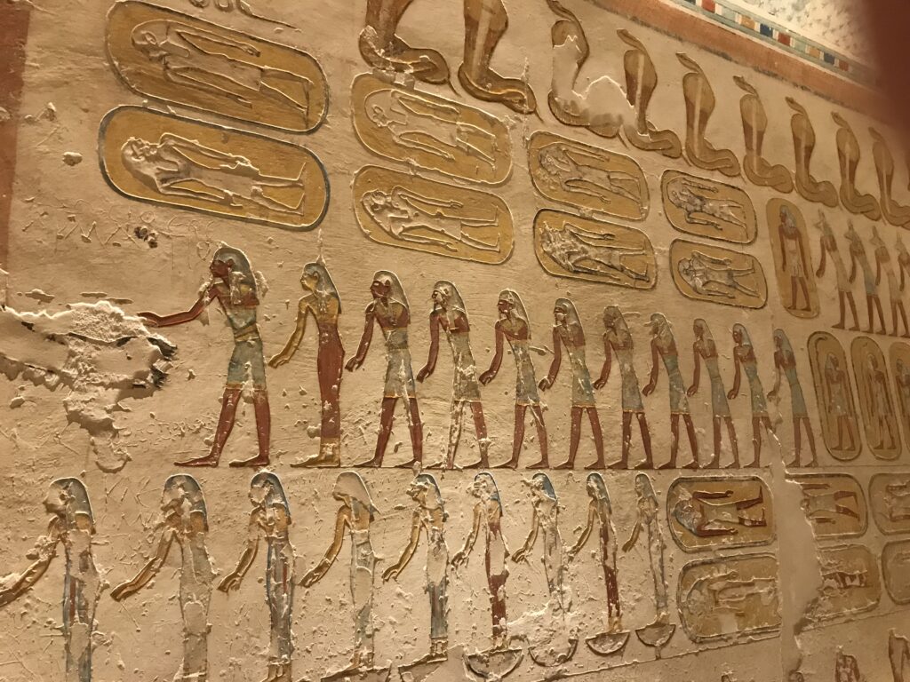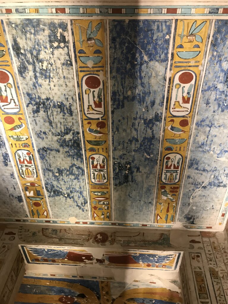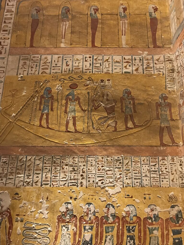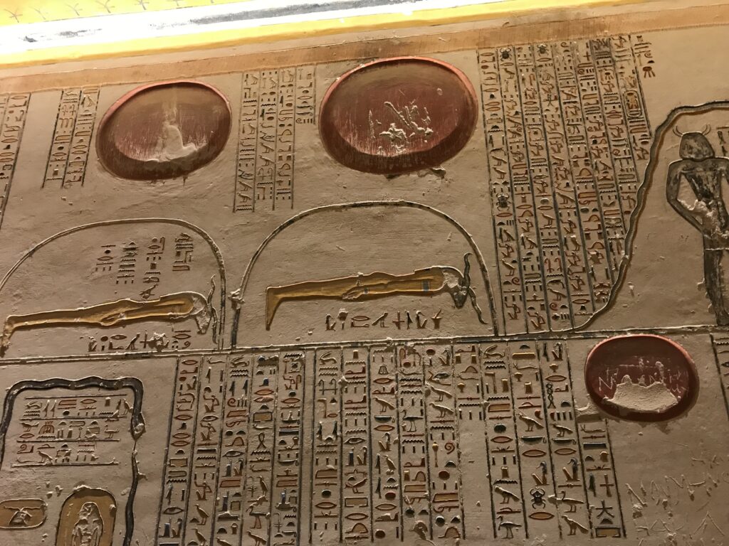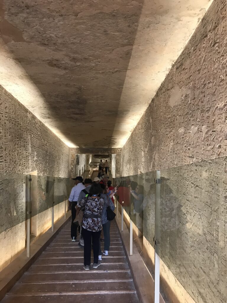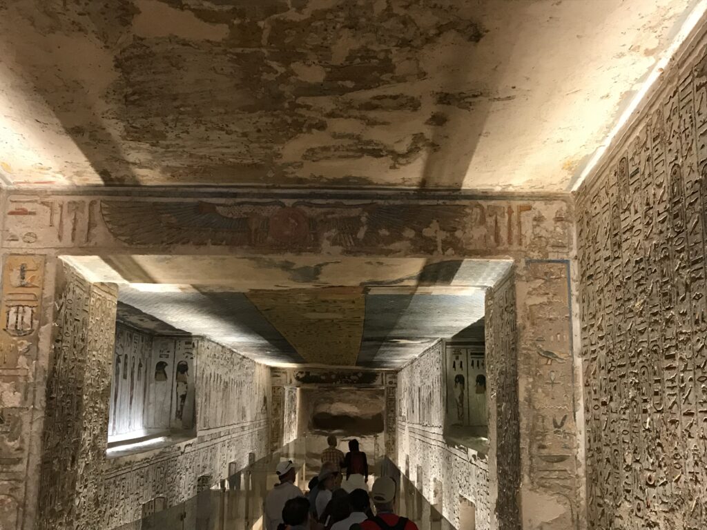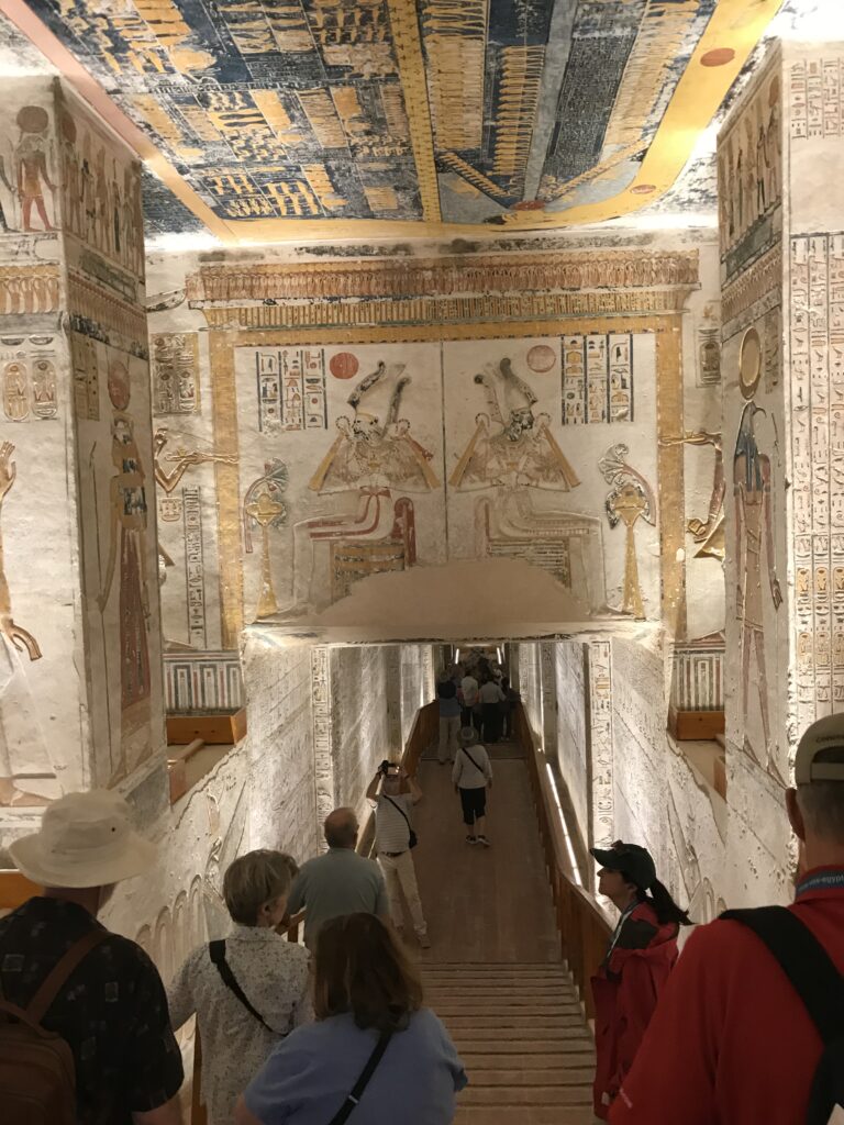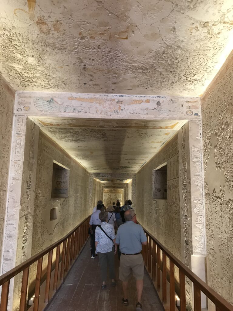 We have arrived to Luxor and the Valley of the Kings, “the world’s greatest open air museum” and a World Heritage site. This area is called the Theban Necropolis. The Valley is on the west bank of the Nile.  It was the burial place of royal figures and noblemen of the New Kingdom.  So far, 63 tombs have been discovered, but archeologists expect to find many more.  Here we visited the tombs of Ramses IV, Ramses III, Ramses, VI, and Ramses IX and King Tut.  The tombs are decorated with scenes from Egyptian Mythology.  Unfortunately most of the tombs have been ransacked by robbers, but the reliefs and hieroglyphics are in tact.  Tarek was able to explain the hieroglyphics and pictures to us.   It is amazing how the colors have remained over the years.  Tarek attributes this to their use of natural pigments.  The tombs evidence elaborate preparations for the next world, in which humans were promised continuing life and pharaohs were expected to become one with the gods. Mummification was used to preserve the body so that the deceased’s eternal soul would be able to reanimate it in the afterlife.  Pets of the royalty were also buried in the area.  Ancient Egyptians believed that the paintings could come to life, so they didn’t need to bury the servants, just paint them on the tomb walls.
