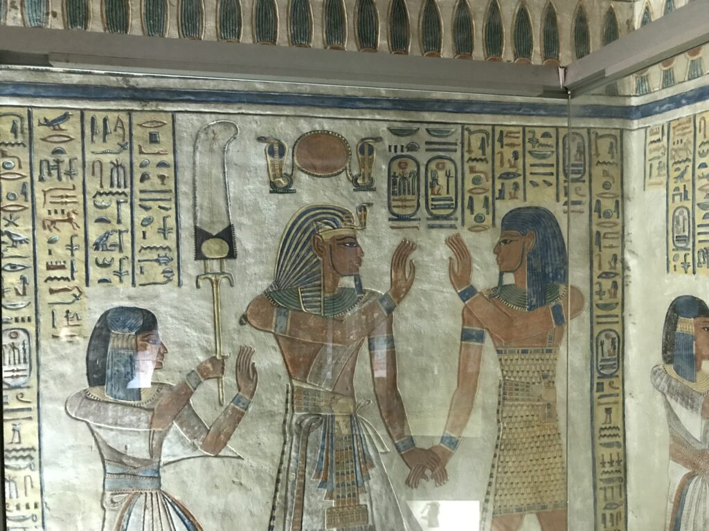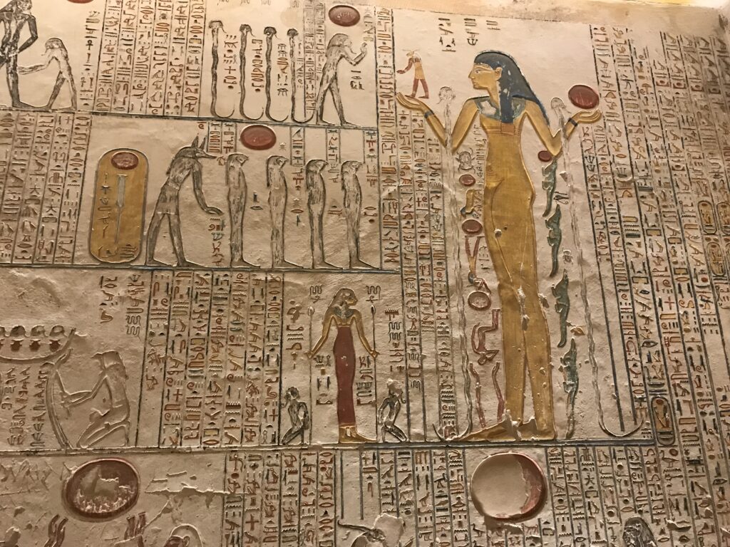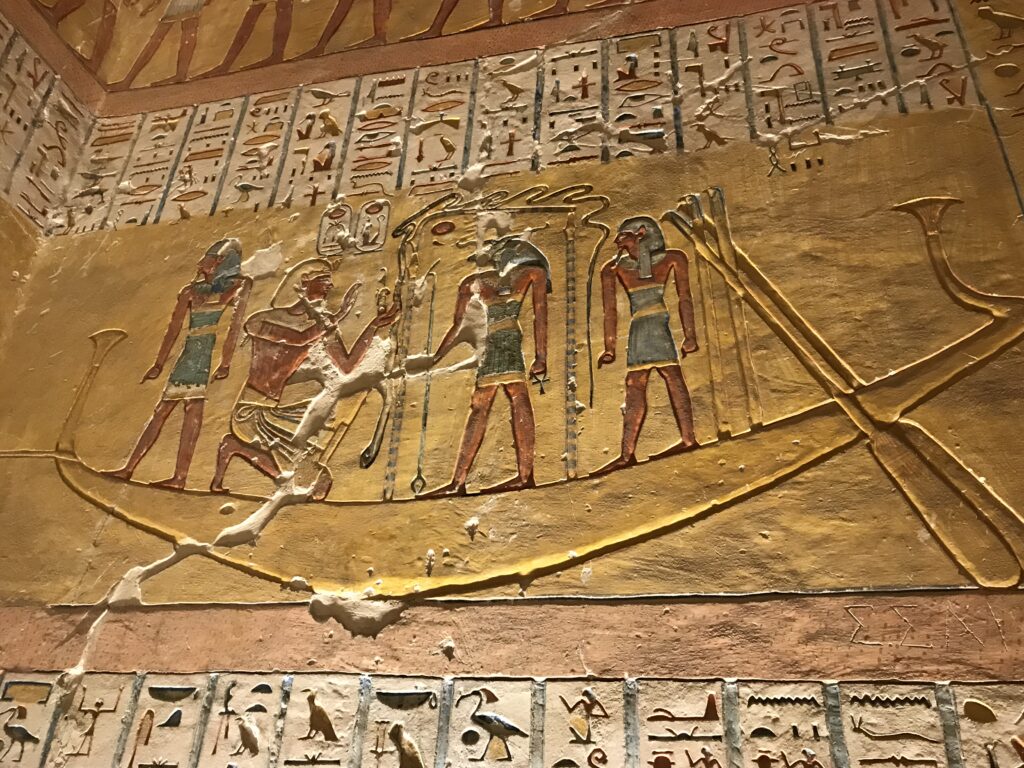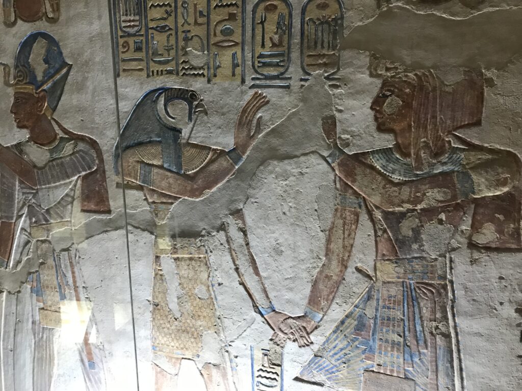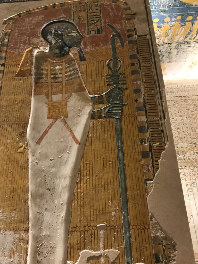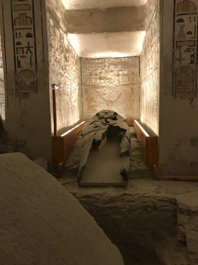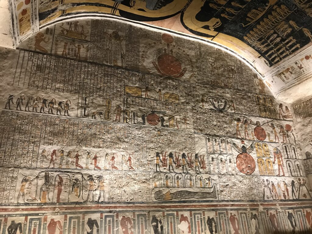 We have arrived to Luxor and the Valley of the Kings, “the world’s greatest open air museum” and a World Heritage site. This area is called the Theban Necropolis. The Valley is on the west bank of the Nile.  It was the burial place of royal figures and noblemen of the New Kingdom.  So far, 63 tombs have been discovered, but archeologists expect to find many more.  Here we visited the tombs of Ramses IV, Ramses III, Ramses, VI, and Ramses IX and King Tut.  The tombs are decorated with scenes from Egyptian Mythology.  Unfortunately most of the tombs have been ransacked by robbers, but the reliefs and hieroglyphics are in tact.  Tarek was able to explain the hieroglyphics and pictures to us.   It is amazing how the colors have remained over the years.  Tarek attributes this to their use of natural pigments.  The tombs evidence elaborate preparations for the next world, in which humans were promised continuing life and pharaohs were expected to become one with the gods. Mummification was used to preserve the body so that the deceased’s eternal soul would be able to reanimate it in the afterlife.  Pets of the royalty were also buried in the area.  Ancient Egyptians believed that the paintings could come to life, so they didn’t need to bury the servants, just paint them on the tomb walls.