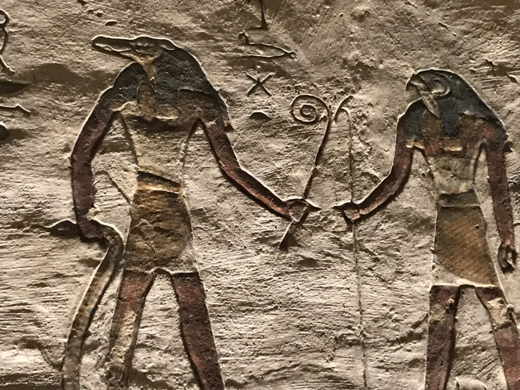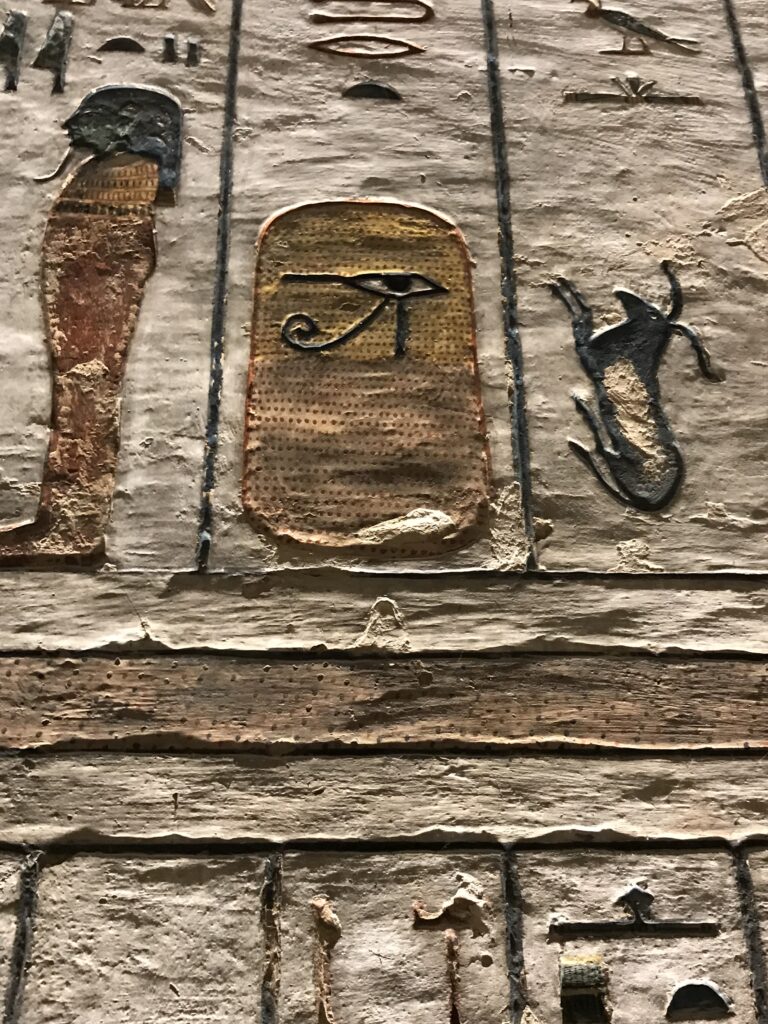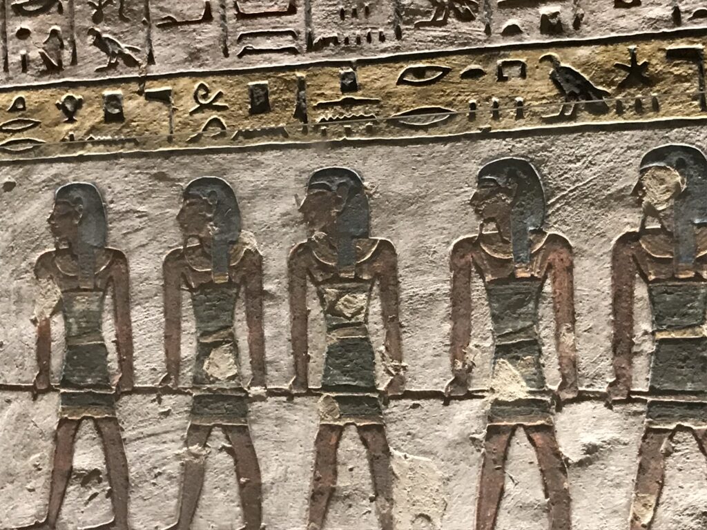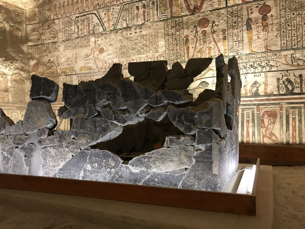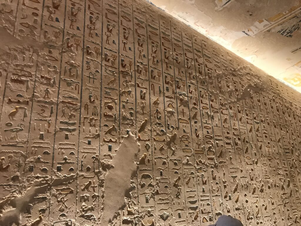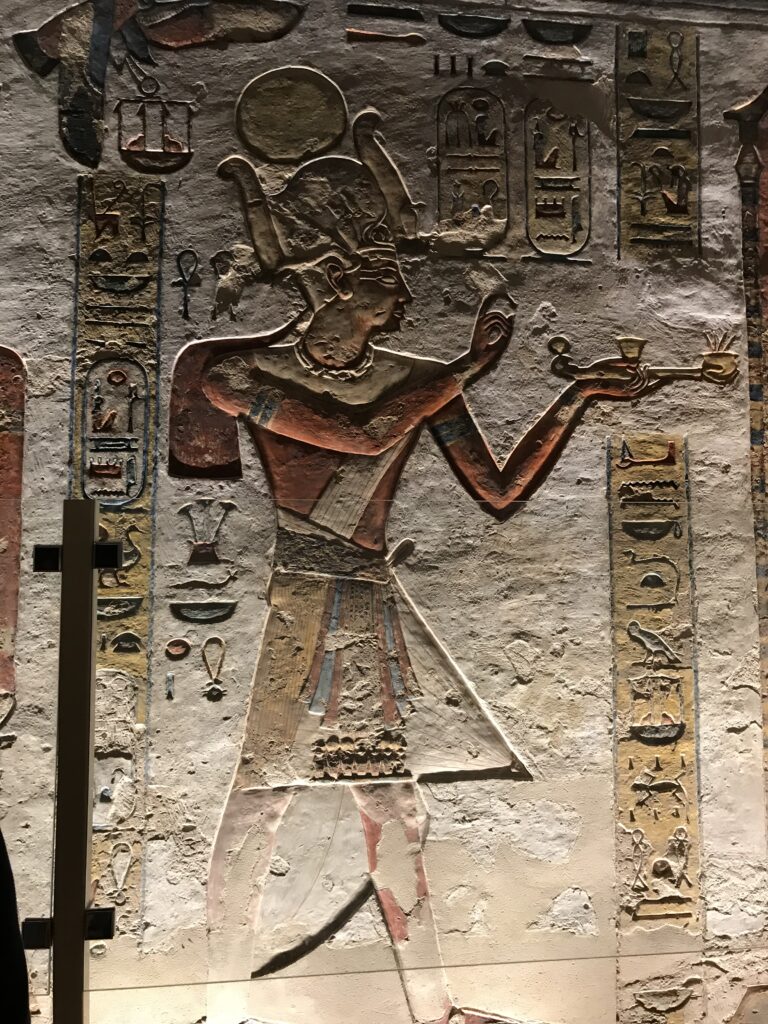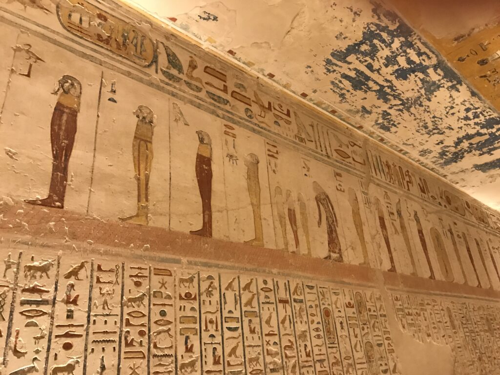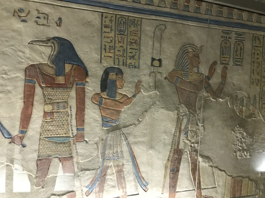 We have arrived to Luxor and the Valley of the Kings, “the world’s greatest open air museum” and a World Heritage site. This area is called the Theban Necropolis. The Valley is on the west bank of the Nile.  It was the burial place of royal figures and noblemen of the New Kingdom.  So far, 63 tombs have been discovered, but archeologists expect to find many more.  Here we visited the tombs of Ramses IV, Ramses III, Ramses, VI, and Ramses IX and King Tut.  The tombs are decorated with scenes from Egyptian Mythology.  Unfortunately most of the tombs have been ransacked by robbers, but the reliefs and hieroglyphics are in tact.  Tarek was able to explain the hieroglyphics and pictures to us.   It is amazing how the colors have remained over the years.  Tarek attributes this to their use of natural pigments.  The tombs evidence elaborate preparations for the next world, in which humans were promised continuing life and pharaohs were expected to become one with the gods. Mummification was used to preserve the body so that the deceased’s eternal soul would be able to reanimate it in the afterlife.  Pets of the royalty were also buried in the area.  Ancient Egyptians believed that the paintings could come to life, so they didn’t need to bury the servants, just paint them on the tomb walls.