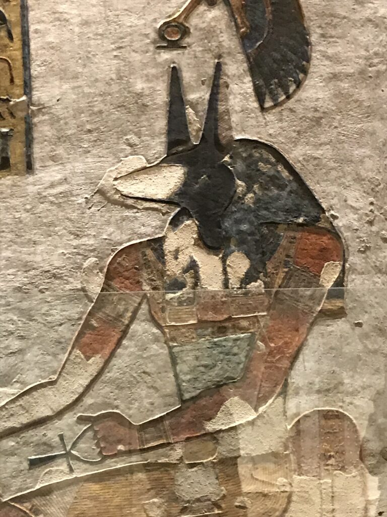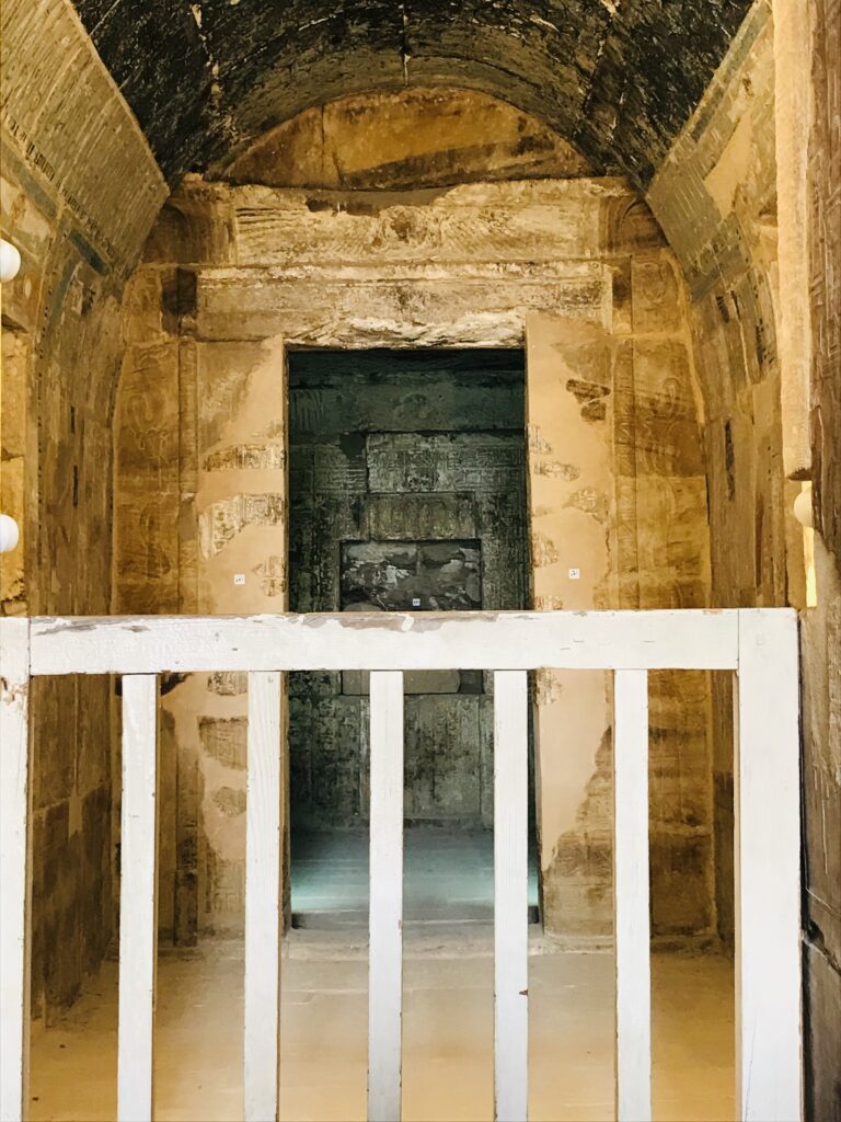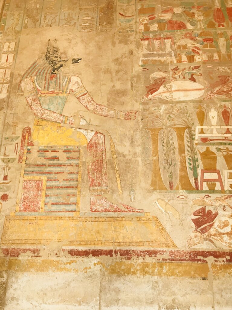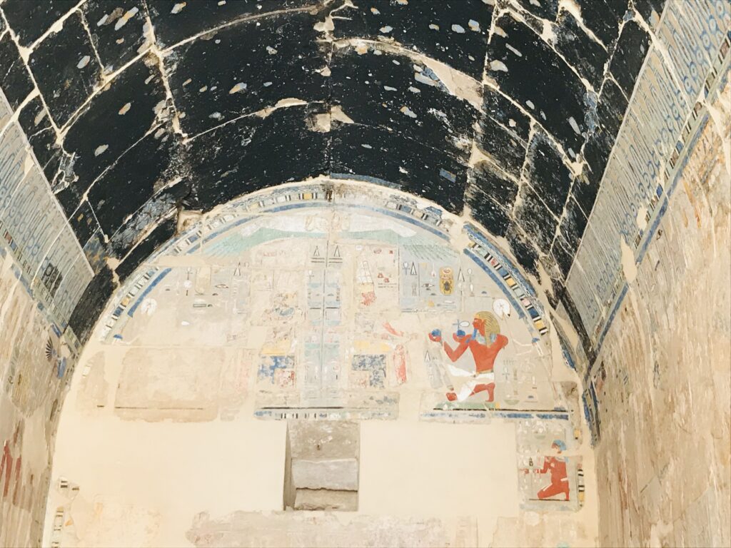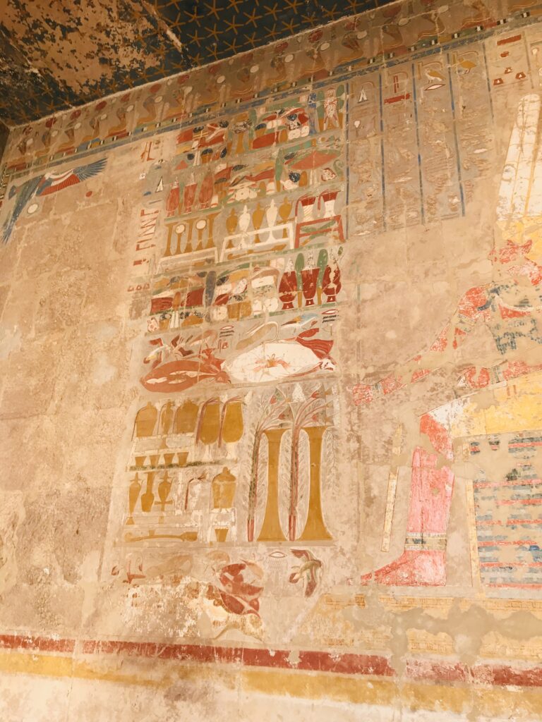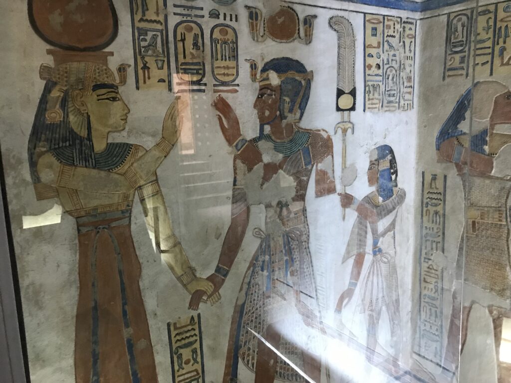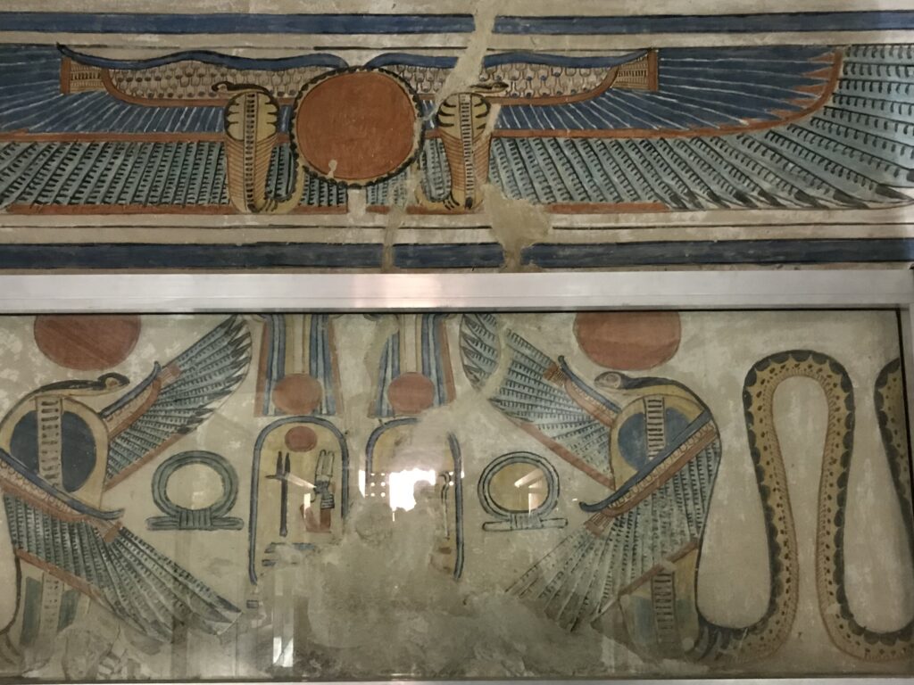 The Valley of the Queens is located on the western bank of the Nile River in Upper Egypt. Over 90 tombs have been found here of various royal women. We visited the two that have been connected due to erosion in the area. Queen Titi lived in the 20th Dynasty and was the wife of Ramses III. The beauty of the tomb shows her wealth and status. This is an interesting tomb because she is portrayed in some places as a young girl with braided hair and bright clothing and in others as a more mature woman, dressed conservatively. Her tomb is in a traditional design: corridor, burial chamber, and ante chambers. Note the vivid colors that remain.