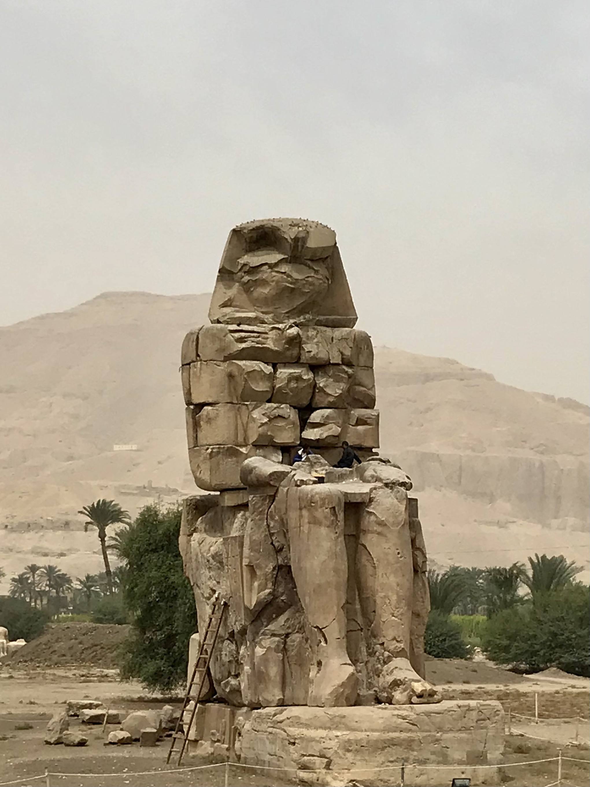 Next, we stopped at the Colossi of Memnon, two 64-foot high statues that depict Amenhotep  III.  They once guarded the gates of the now ruined mortuary temple, Al-Deir Al-Bahari Temple. They were constructed in 1350 B.C.E. each out of a single block of sandstone. They face East looking toward the Nile.