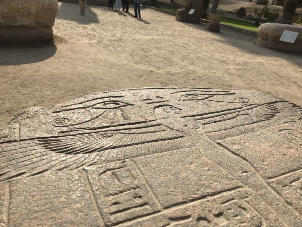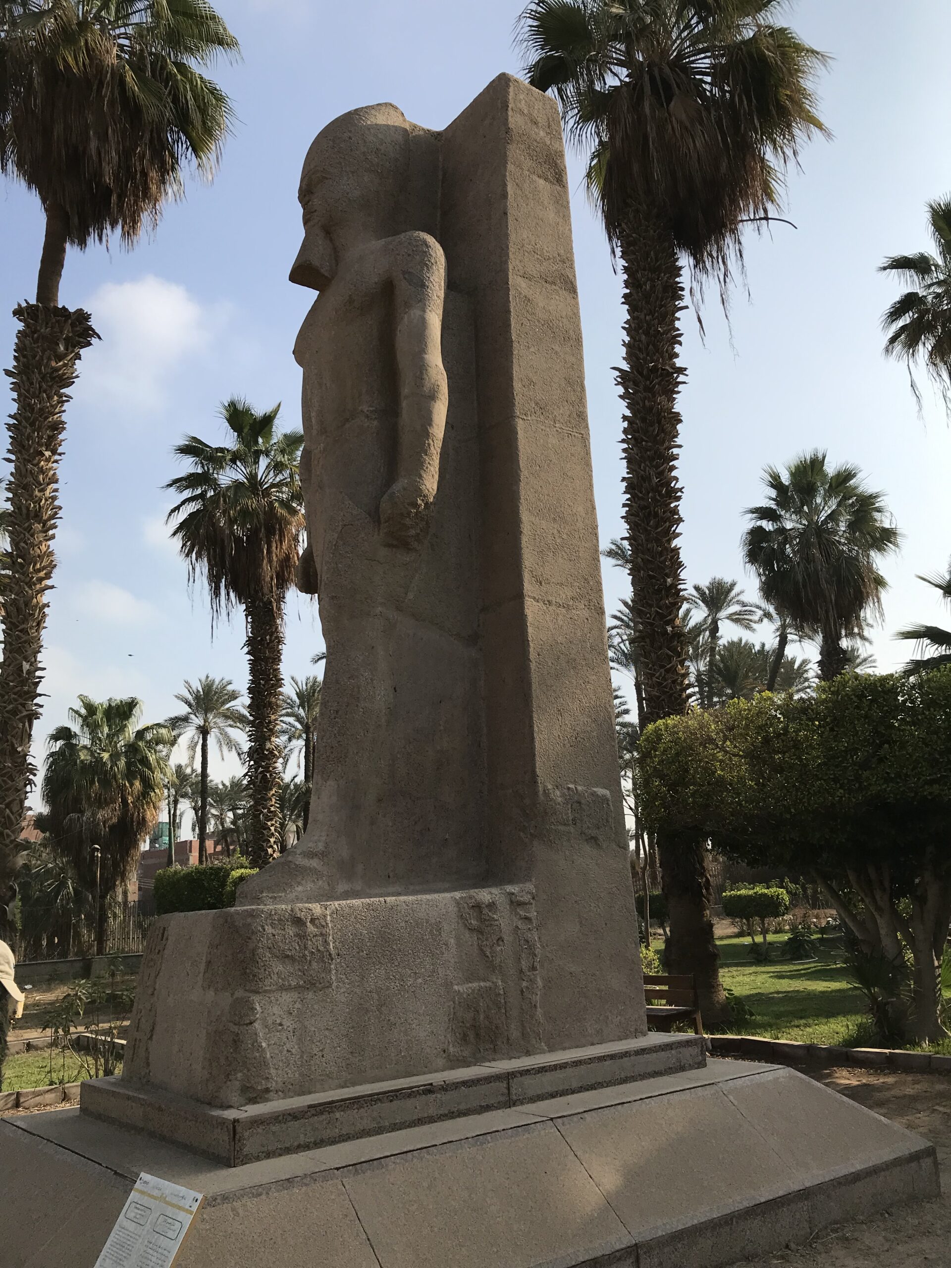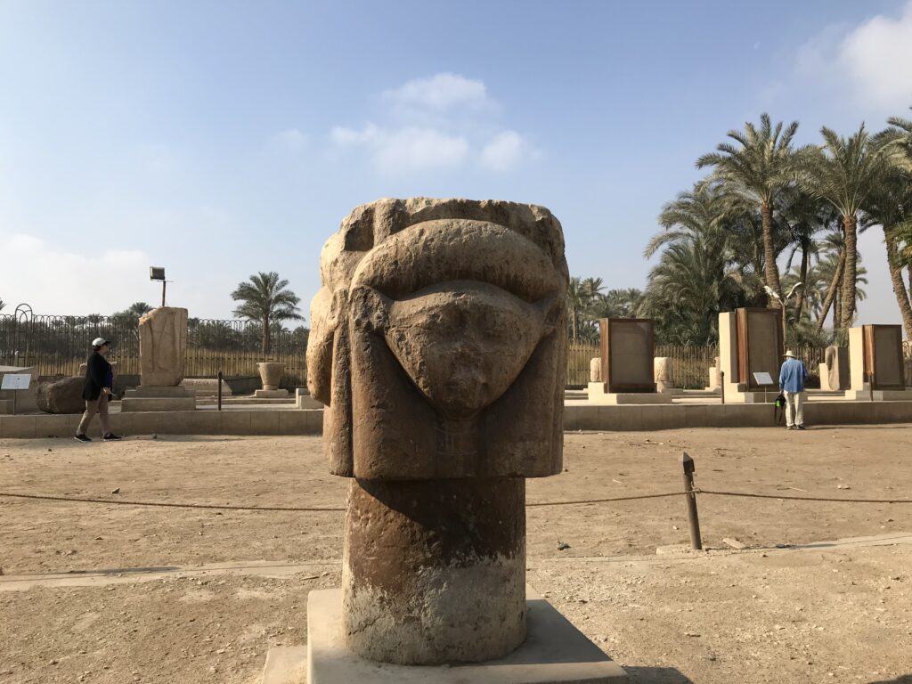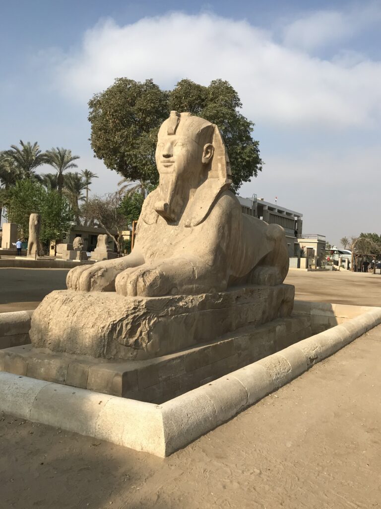 Memphis was Egypt’s first capital. It is located south of the Nile River Delta and Cairo. The Memphis Archeological Zone is a UNESCO World Heritage site. The city was founded about 2925 B.C.E. by Menes who reportedly united the prehistoric kingdoms of Upper and Lower Egypt. It is one of the most important religious and worship places dedicated to the god Ptah. We started at the open-air museum. The museum exhibits a limestone colossus of king Ramses II (1305-1237 BC ) and a giant alabaster sphinx weighting more than 80 tons, that once stood out side the massive temple of god Ptah. There are also remains of granite coffins and commemorative tablets from later periods.