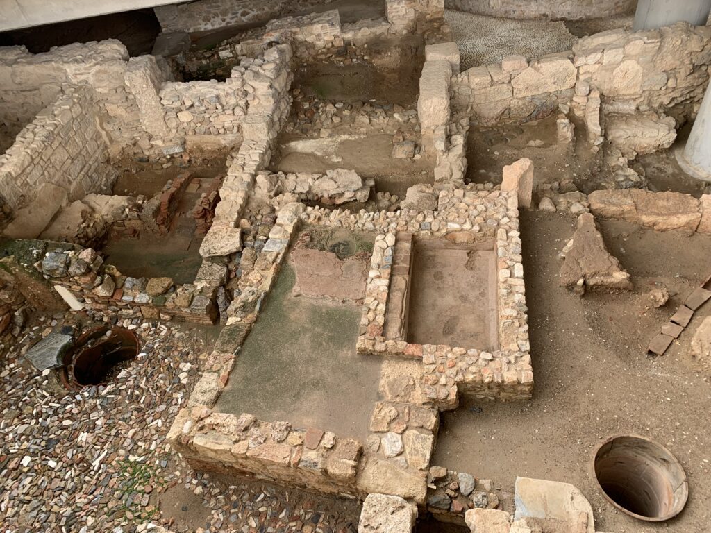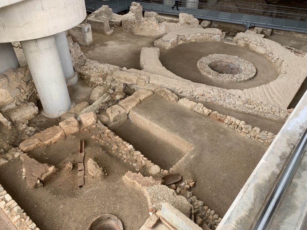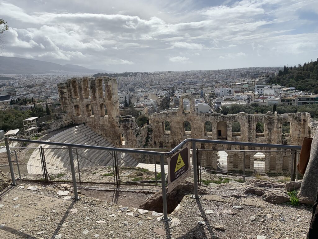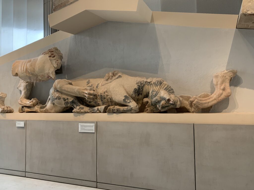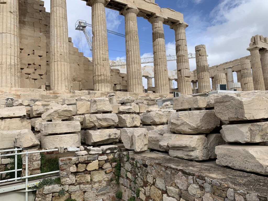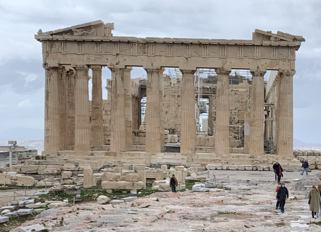 This was our day to spend at the Acropolis and Parthenon.  It was the highlight of this part of the tour.  After breakfast, we went to the Acropolis Museum.  It was fascinating.  On the entrance and in the foyer, the floor was see-through, so we could look at some completed excavation as well as continuing work.  There are four levels to the museum.  The entry level has the area to observe archeological work.  The first floor contains findings from the slopes of the Acropolis. The second is the Parthenon Gallery, modelled after the Parthenon with spectacular views of the city.  The exterior was intended to resemble the Parthenon.  The columns mirror those of the Parthenon. The third floor has the Archaic Gallery with sculptures from the Archaic period. After thoroughly exploring the artifacts here, we headed to the Acropolis and the Parthenon itself.