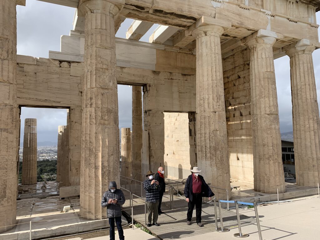 Inside the Athenian Acropolis are the Parthenon, built by Ictinus, the Erechtheon, the Propylaea, which is the monumental entrance to the Acropolis, designed by Mnesicles, and the temple to Athena Nike.  The Parthenon is the great Temple to Athena.  The climb up the “hill” was strenuous, but we had done lots of climbing already to prepare us.  This is the most striking and complete ancient Greek monumental complex still existing today and is a UNESCO World Heritage Site.  It is amazing to see the remains that are very much intact over 2,600 years.  Also, the views of Athens from the site are spectacular.  Having heard and read so much about this site over the years, it was breathtaking to be able to stand among the monuments.