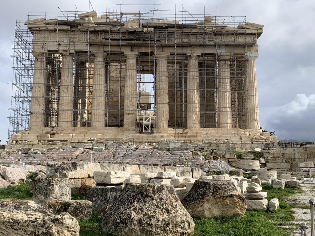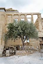 Next we saw the Erechtheon, most unusual temple, since it is dedicated to several gods, including Athena, Poseidon, Hephaestus, as well as the legendary king of Athens, Erechtheus. It is also tied to the legend of the contest between Poseidon and Athena for control of the city.  Supposedly,  Poseidon struck a rock with his trident, creating a saltwater spring.  Athena planted the world’s first olive tree.  The people chose her gift as more useful, so named the city Athens.  An olive tree stands nearby today that is said to be related to that first olive tree.