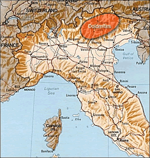 The Dolomite mountains lie in the eastern section of the northern Italian Alps. The range has several impressive peaks, 18 of which are over 10,000 feet. The highest point is the Marmolada Mountain at 10,964 feet. The range and its characteristic rock take their name from the 18th-century French geologist Dieudonné Dolomieu, who made the first scientific study of the region and its geology. The mountains are formed of light-colored dolomitic limestone, which erosion has carved into grotesque shapes. The resulting landforms include jagged, saw-edged ridges, rocky pinnacles, screes of limestone debris, deep gorges, and numerous steep rock faces at relatively low levels. The range has 41 glaciers. This beautiful mountain range of the Southern Alps was declared a world cultural heritage site by UNESCO in 2009.