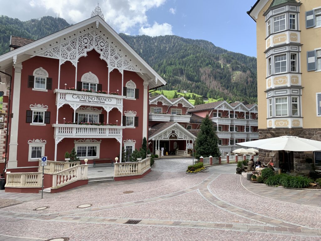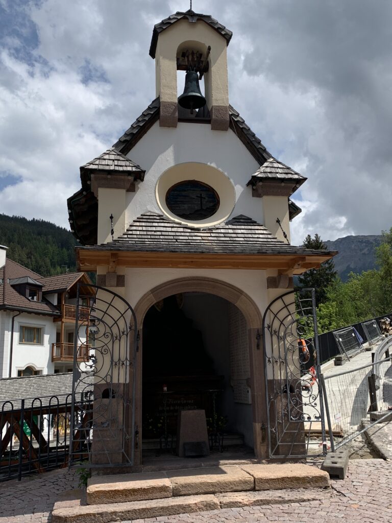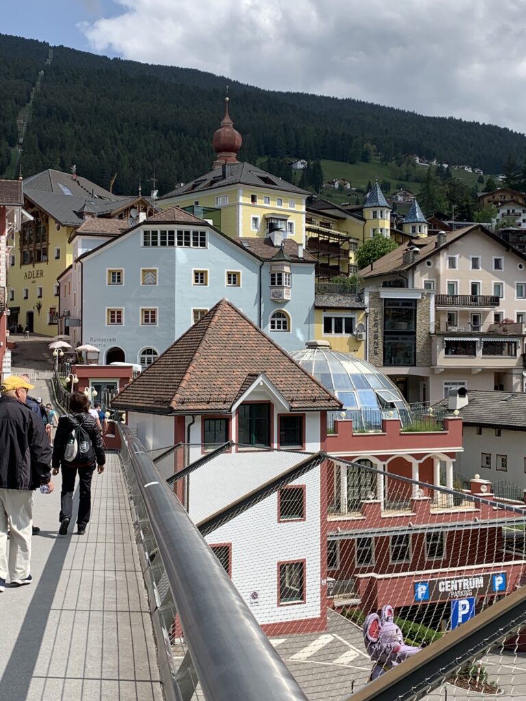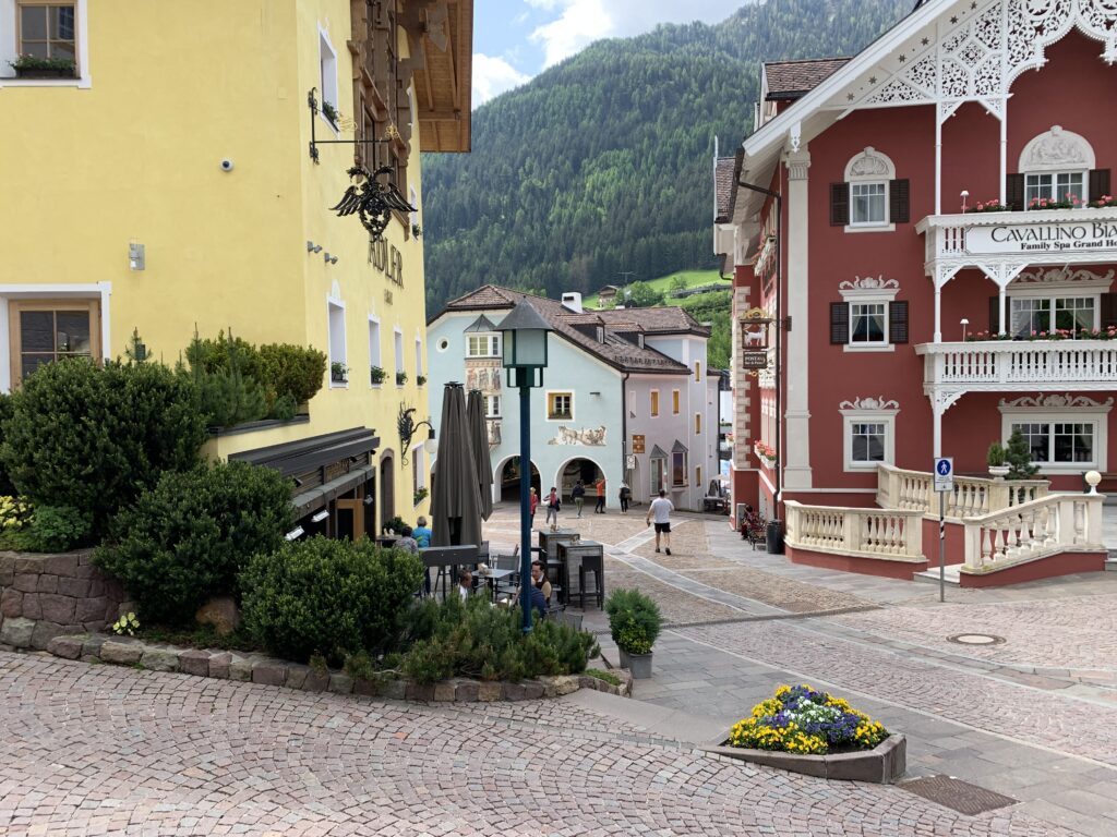 The pedestrian area in Ortisei connects the chapel of Saint Ulrich to the Antonius church and is described as the most beautiful shopping street in the Dolomites.